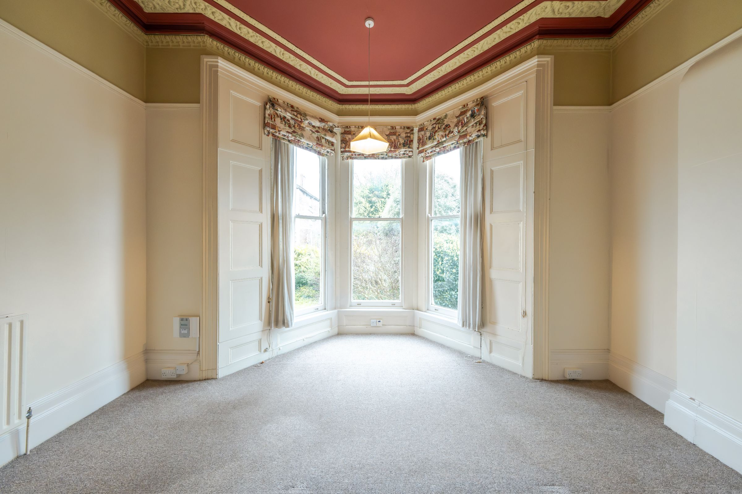 is particularly impressive in scale, featuring a beautiful bay window that fills the room with natural light, alongside high