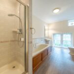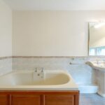 bathroom is equally impressive in scale, offering a spacious and well-appointed setting. It features a separate shower
