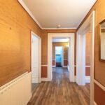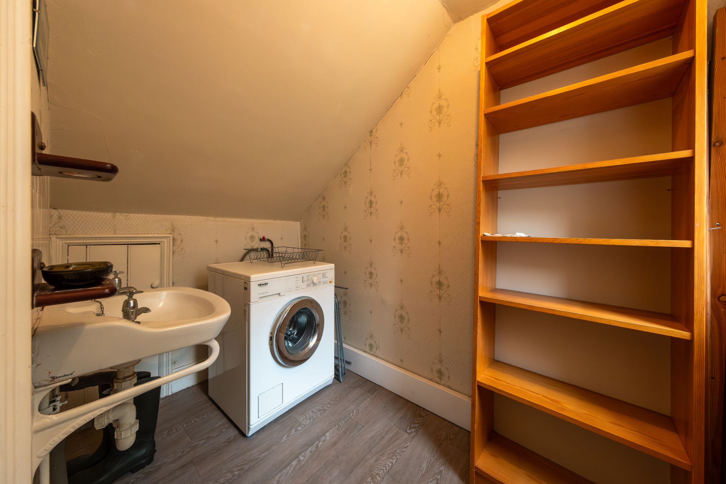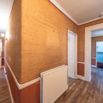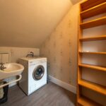 The hallway provides access to all rooms and is finished with wood-effect laminate flooring, complemented by an integrated intercom system. It also benefits from both a convenient store room and a large additional storage space accessed from a drop-down hatch between the two bedrooms with an integrated ladder. At the far end of the hallway, there is a utility area equipped with a sink and plumbing for a washing machine.