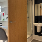 Private ensuite shower room with contemporary fittings, mirror and heated towel rail.